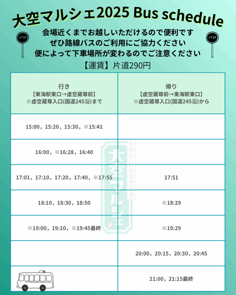 大空マルシェ2025の開催に伴い,東海駅東口から会場方面への路線バスが増便されます!